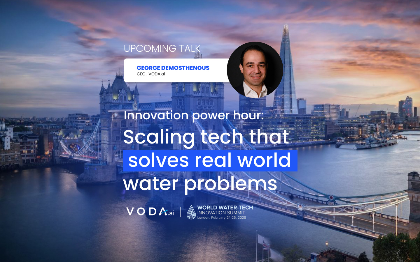 George Demosthenous CEO of VODA.ai, will be speaking in the session “Innovation Power Hour: Scaling Tech That Solves Real World Water Problems”. This session boasts a dynamic showcase of breakthrough innovation in the water sector, featuring early and growth-stage companies with exciting technologies and business models shaping the future of water.